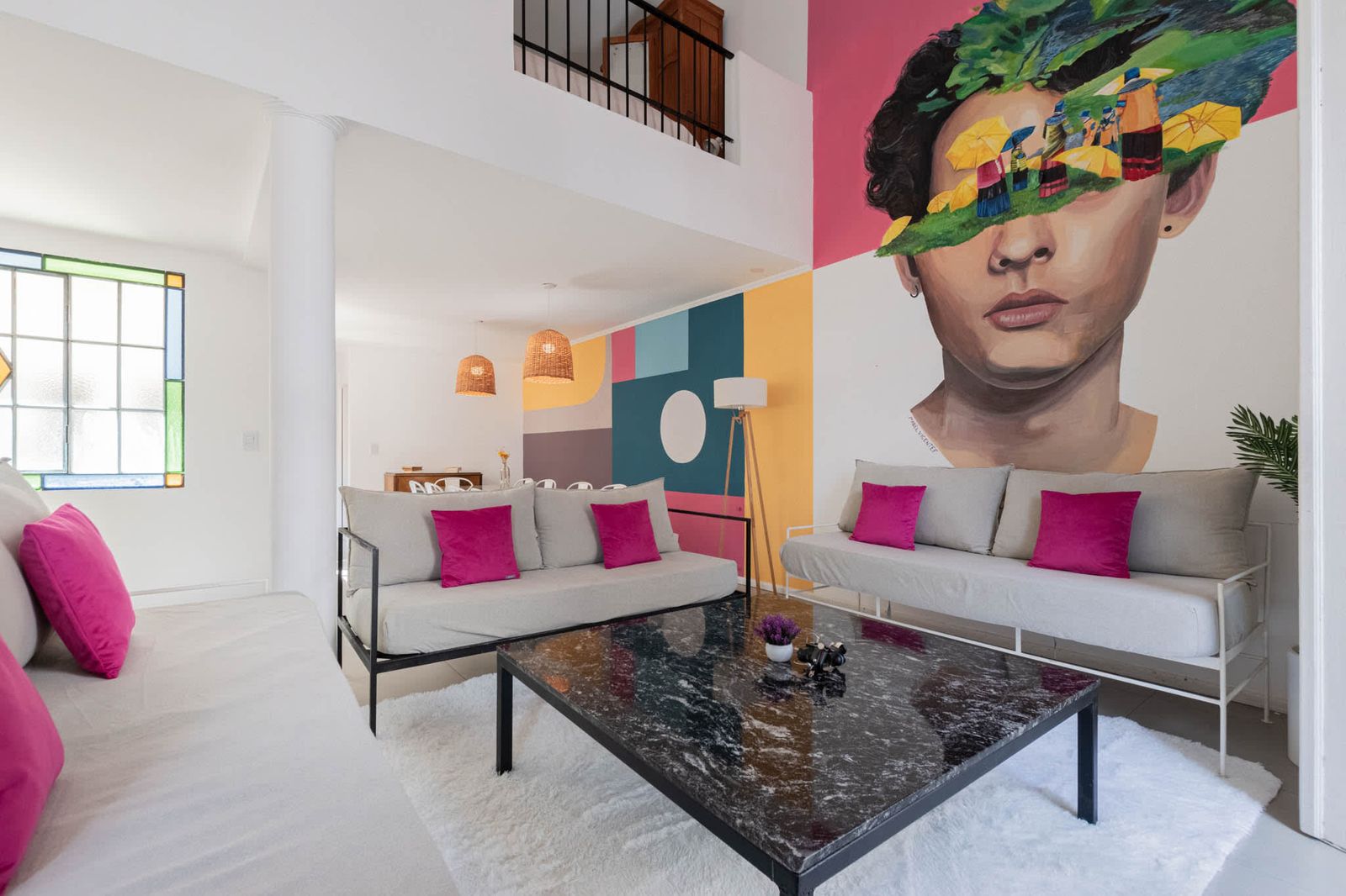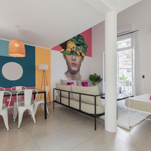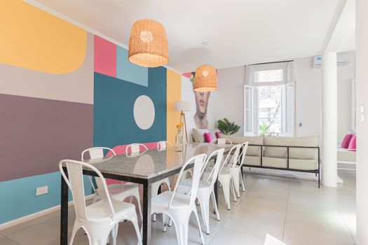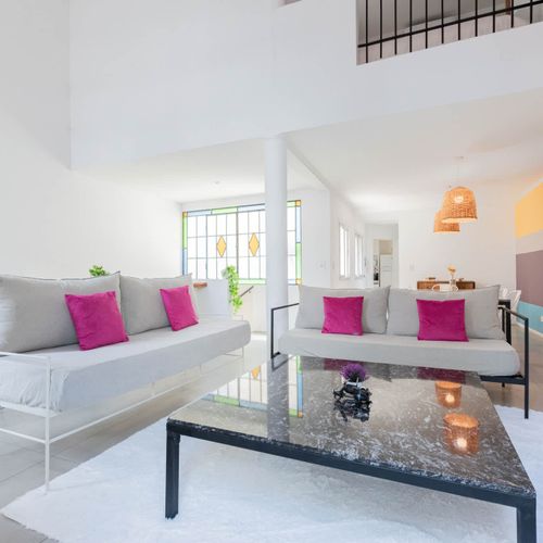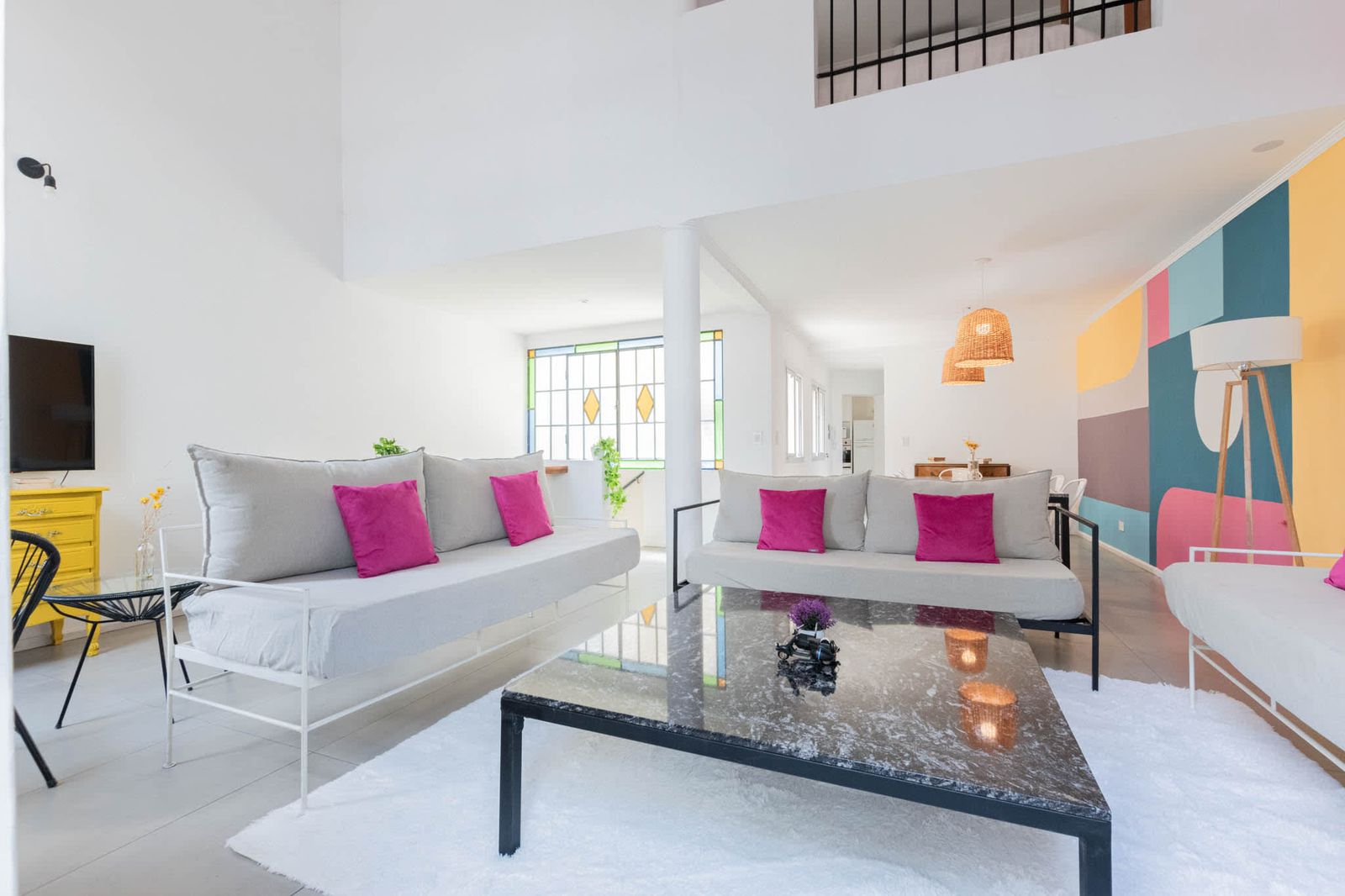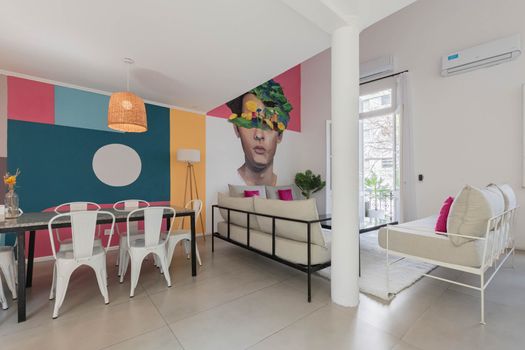 The apartment offers a large double height ceiling on the Living room area that is connected to the dining room and the kitchen space.