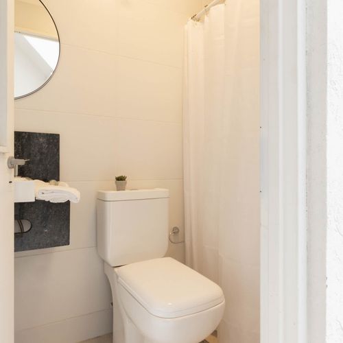 There is a wide social area where the living room, dining room and kitchen merge. There are 2 comfortable sofa beds in the living room. Next to this social area, there is a sunny patio, with an electric BBQ for meat and veggie lovers. By the patio you can find one of the bathrooms and the main bedroom.